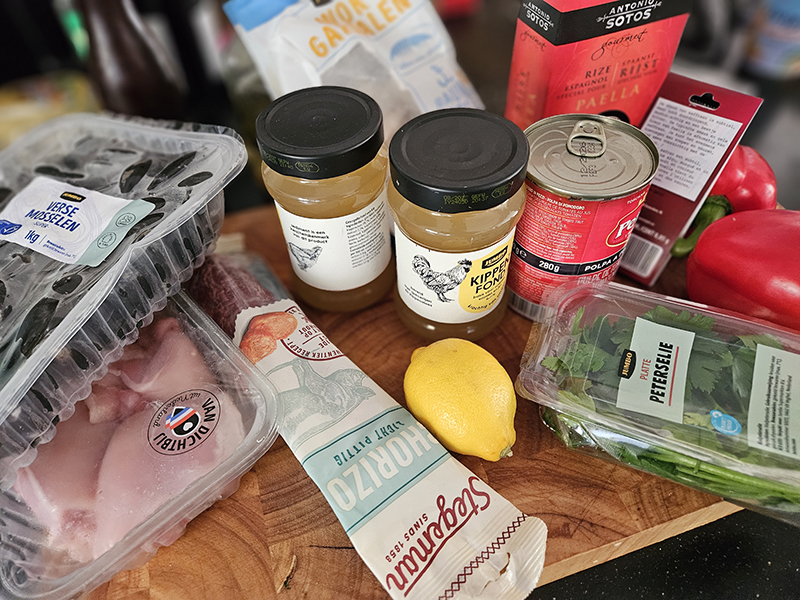 Voeg de laatste 4 minuten de gamba's toe en de laatste 2 minuten de mosselen