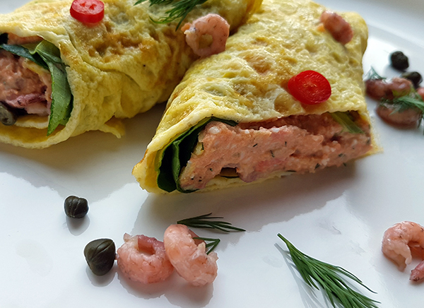 Haal de ei uit de pan en vul deze met fijngesneden little gem, zalmsalade en hollandse garnalen.